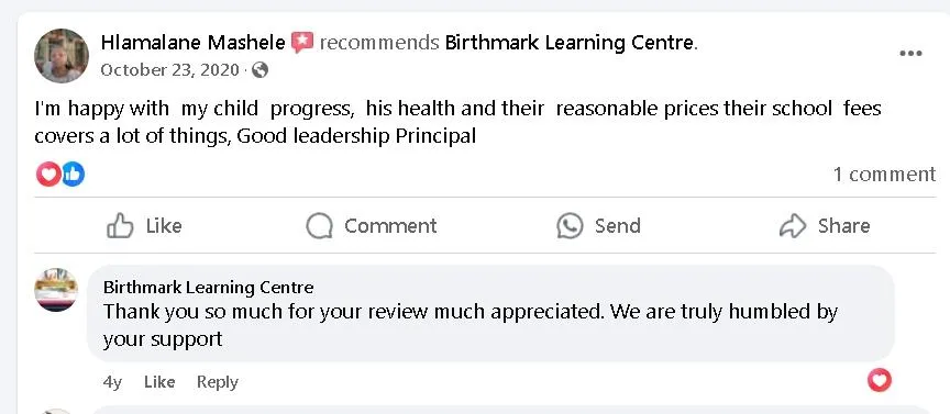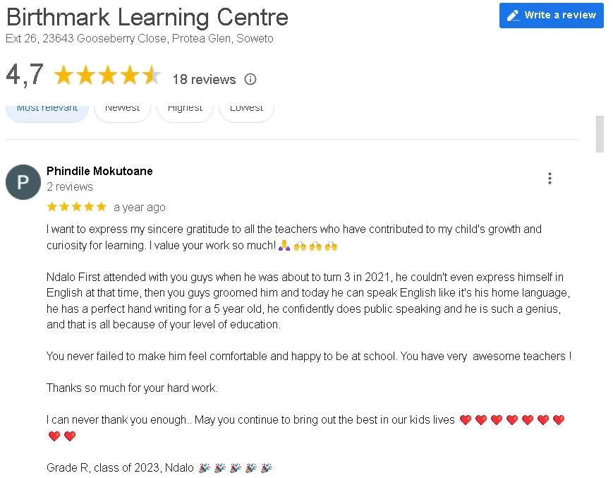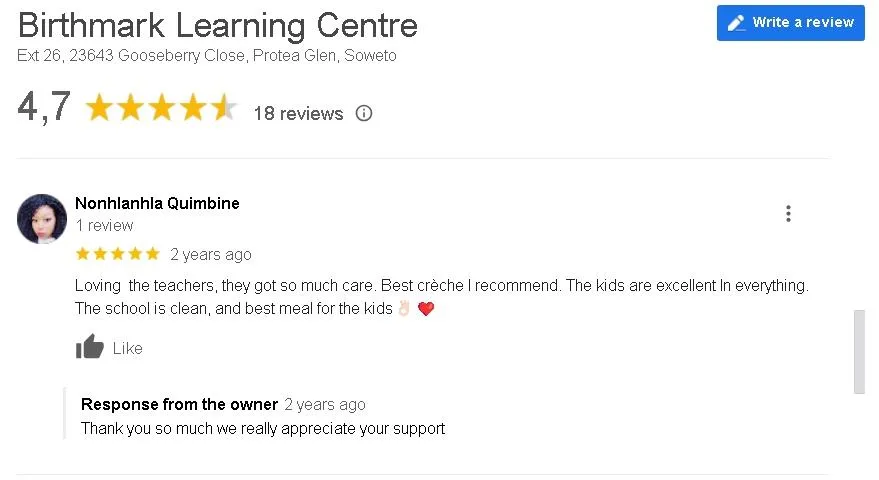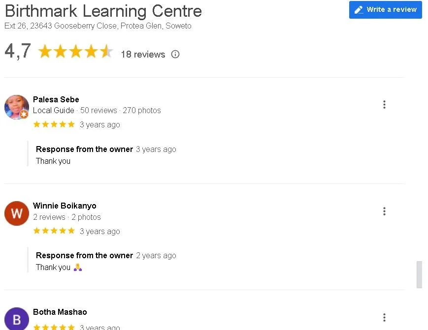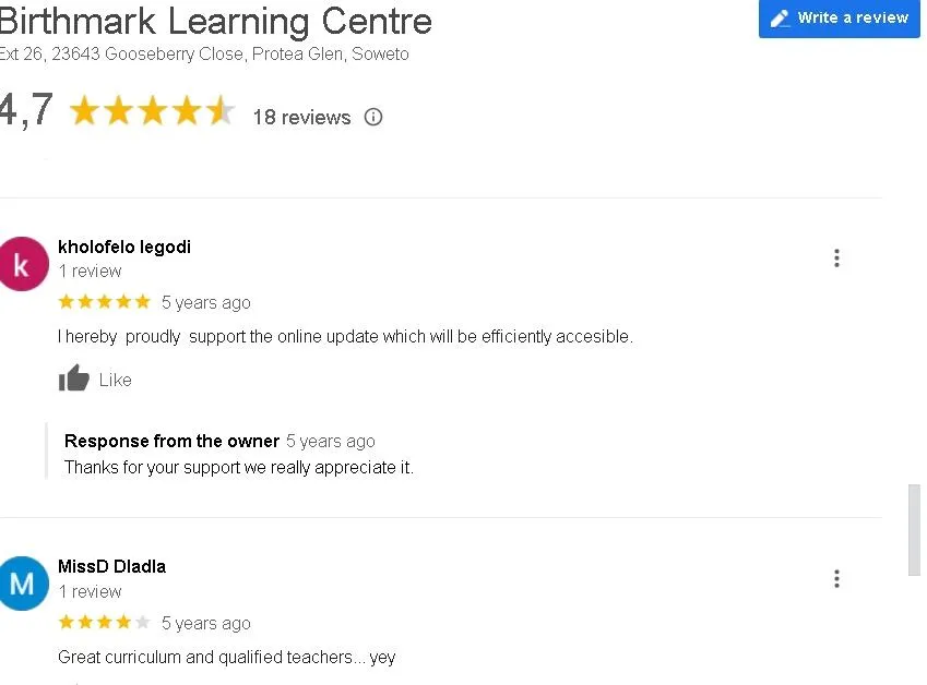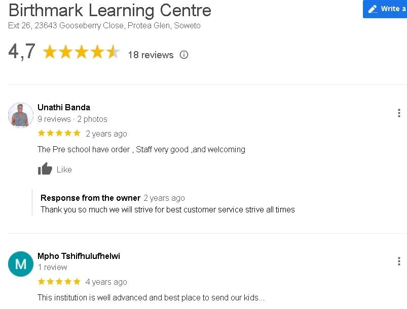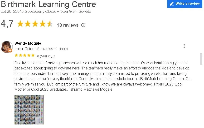 "Birthmark Learning Center is a private learning institute designed to provide services to the kids between the ages of 0 months to 6 years. We are based in Protea Glen ext 26 and have a second branch in Protea Glen ext 24 Our learning objectives are to provide the quality education for each and every child in our center We also aim to develop a strong and solid foundation for all our children. We also generate the spirit of excellency in all we do"